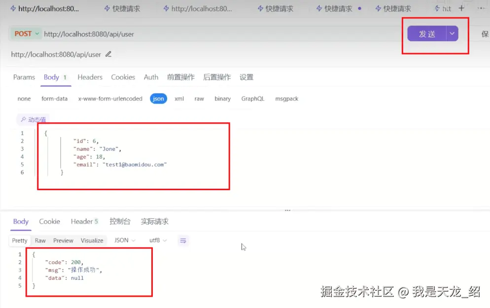 使用@PostMapping注解进行标识。返回的类型都使用Result,以后常见的方法都会统一使用这个Result进行返回。post使用的数据它床底的是这个请求体。需要在这个request body注解进行标识。要保存的话,就用userService.save()方法进行保存就可以了。只要userService.save(user)