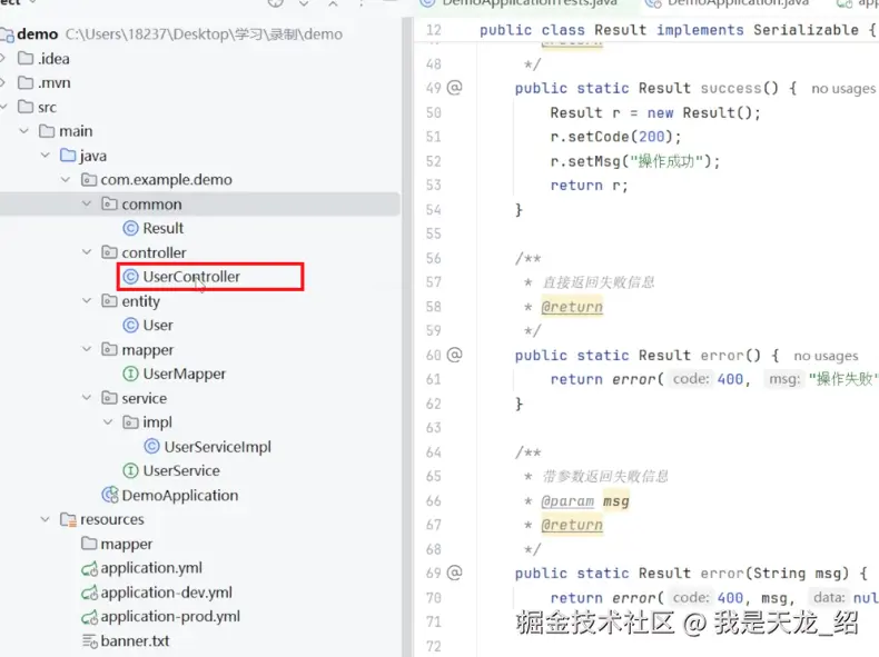 给前端返回同样类型的对象,便于前端判断和处理数据。 那么这个对象对应的类就叫做统一返回结果类。