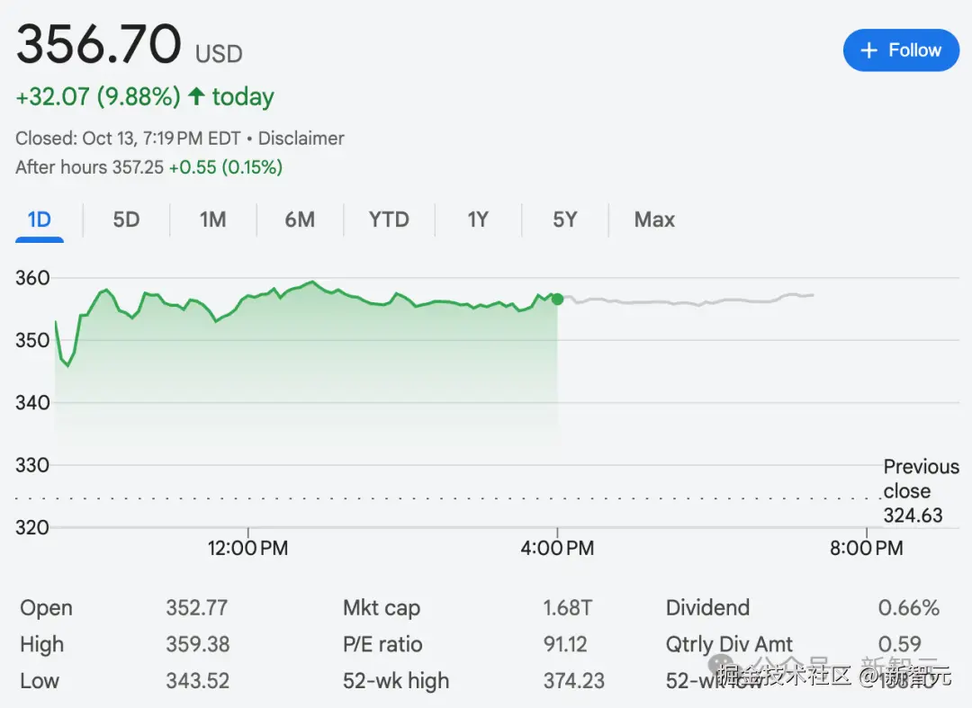消息公布后,博通股价一度大涨近 10%,市值达 1.68 万亿美元。
