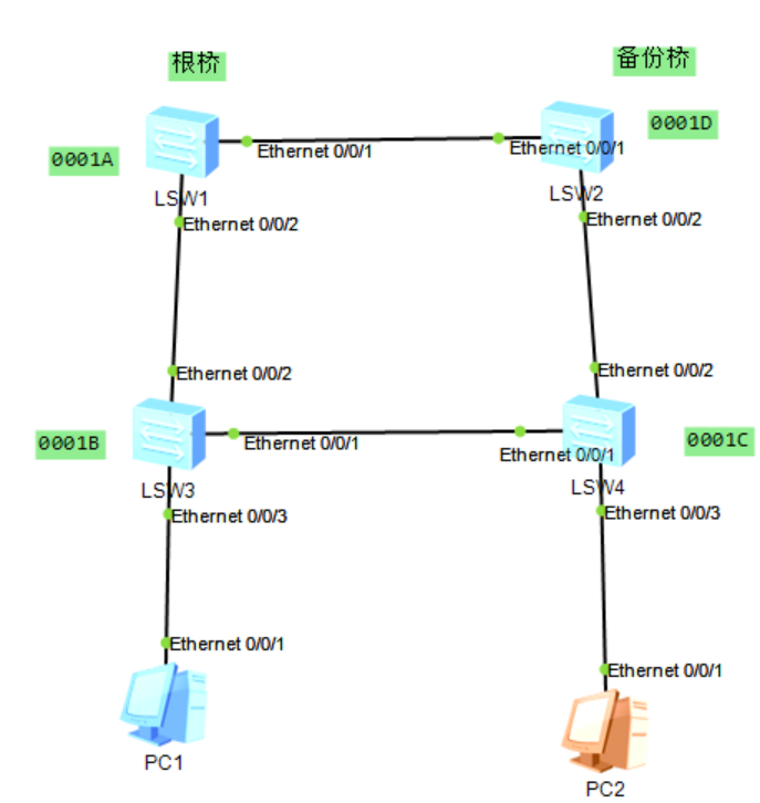 在各交换机配置STP,使得A交换机是根桥,D是备份桥