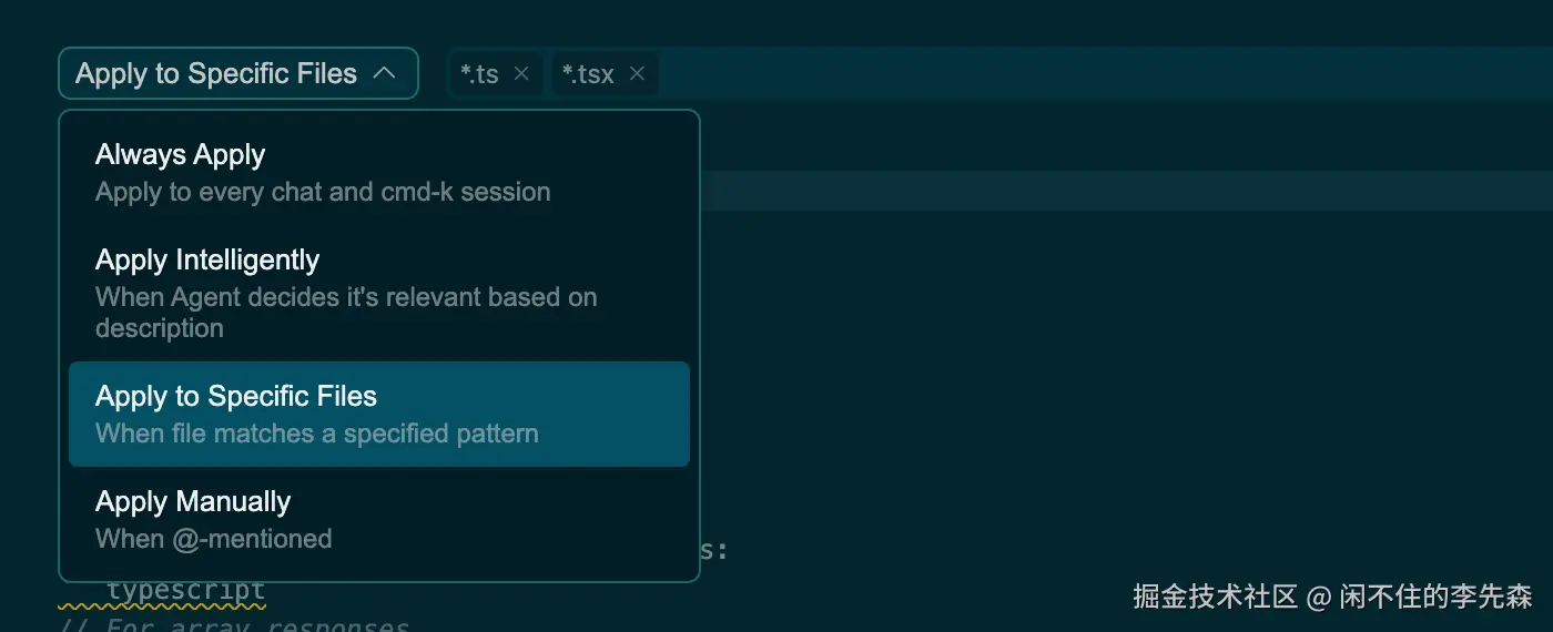 每个规则文件使用 MDC(.mdc) 格式编写,这是一种同时支持元数据与内容的格式。通过规则类型下拉菜单控制规则的应用方式: