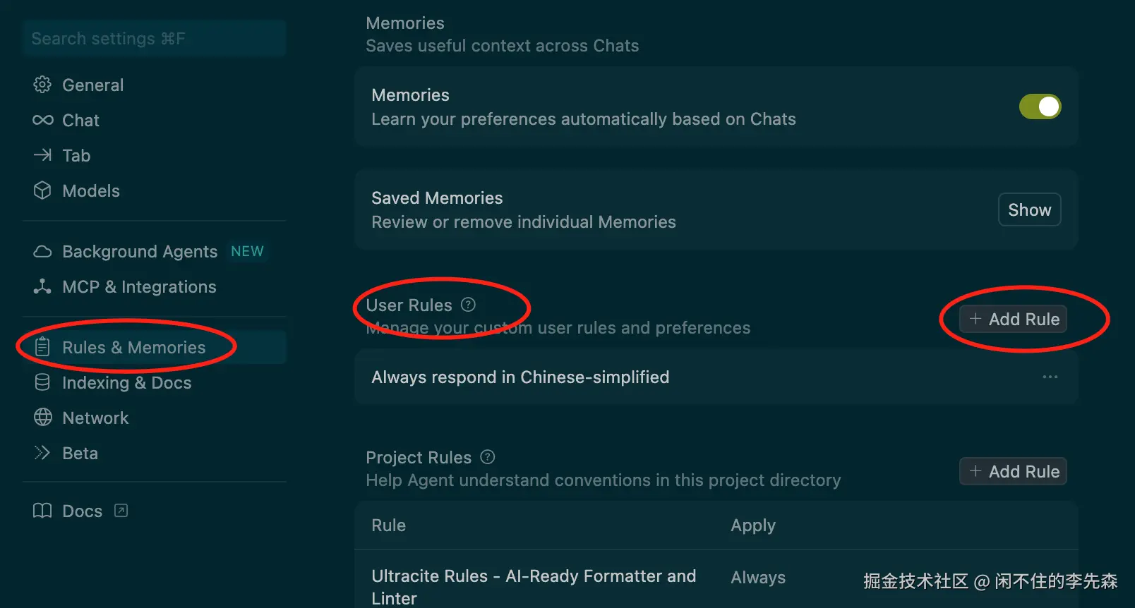 用户规则是在 Cursor Settings → Rules 中定义的全局偏好,适用于所有项目。它们为纯文本格式,适合设置沟通风格或个人编码偏好。
