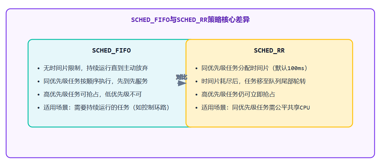 - SCHED_FIFO(先进先出实时调度):同优先级任务按顺序执行,高优先级任务可抢占,任务一旦获得CPU将一直运行直到主动放弃或被更高优先级任务抢占