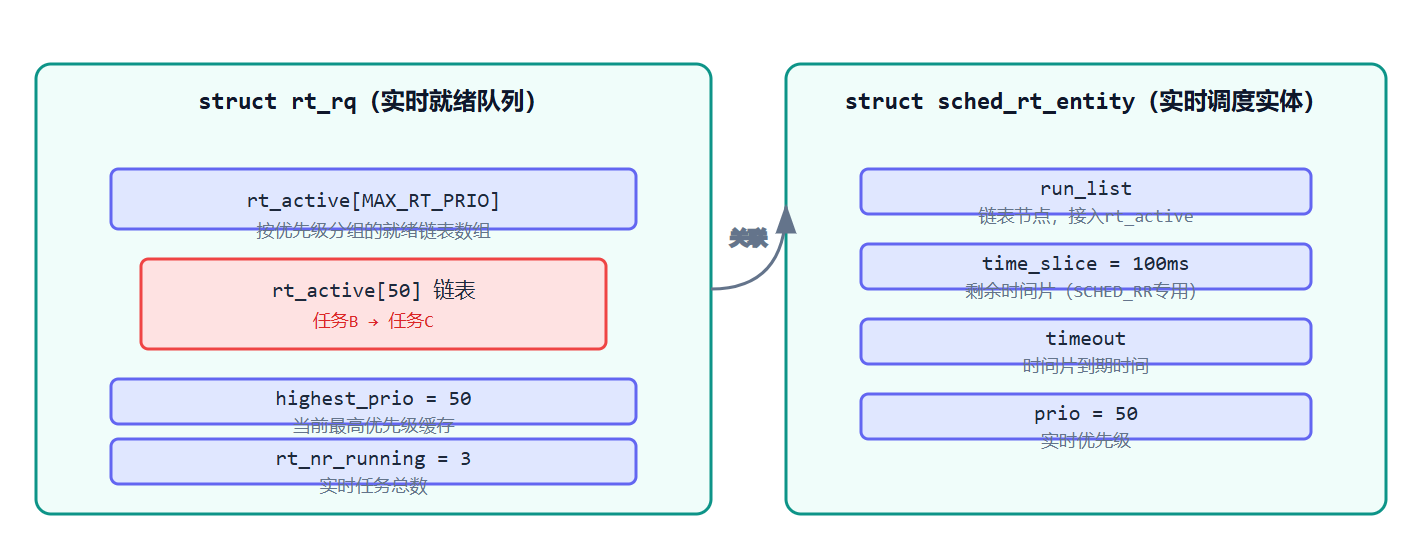 实时调度器通过两个核心数据结构管理实时任务:sched_rt_entity