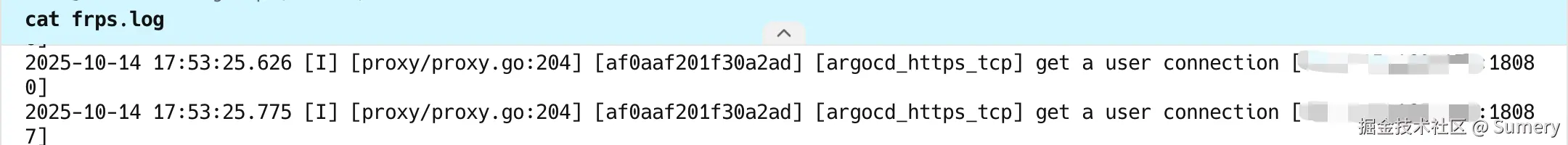 frpc 部署 : 在内网机器上启动 frpc,启动不报错即为正常运行,日志文件是日志文件配置在了当前目录下的