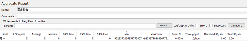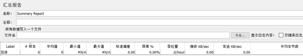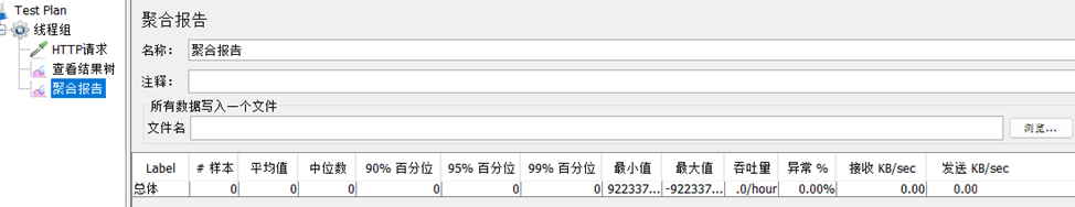 - 汇总报告:汇总报告通常用于实时展示Jmeter性能压测中的各项性能指标,并且支持将汇总报告中的数据写入到自定义的文件中,如下图所示。