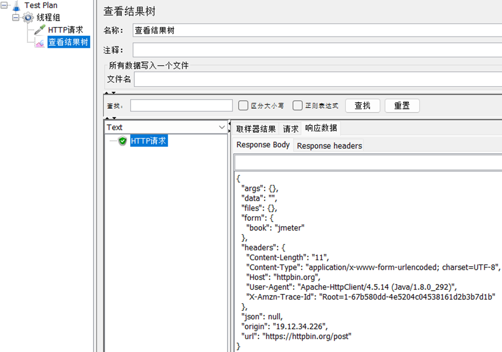 在线程组下再添加一个查看结果树元件,用于查看HTTP请求取样器的调试运行结果,添加完成后,即可调试运行Jmeter,如下图所示,在运行完成后,可以从查看结果树中看到HTTP请求取样器运行成功,并且待测试的接口正确的返回了相关的数据。