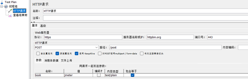在确定了待测试的接口地址后,我们就可以使用Jmeter 来编写对该接口进行性能测试的脚本了,在Jmeter中,新建一个线程组,并且在该线程组下添加HTTP请求取样器,如下图所示,在HTTP请求取样器中,协议中输入https,因为待测试的接口是一个https协议的接口,服务器名称或者IP中输入httpbin.org,因为待测试的接口的域名为httpbin.org,端口号中输入443,因为https协议的默认端口号为443,HTTP请求类型选择POST,路径中输入/post,在请求参数中输入名称为book,值为jmeter。