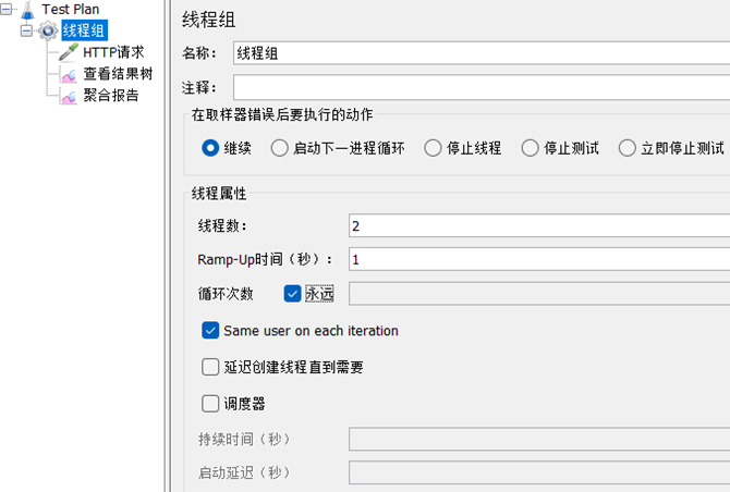 在完成了上述的步骤后,一个简单的性能压测脚本就编写完成了,此时返回线程组界面,设置线程数为2,循环次数设置为永远,如下图所示,设置好了后,点击Jmeter界面的运行按钮,即可开始对接口进行性能压测了,性能压测时,切换到聚合报告元件下,即可查看到Jmeter性能压测时的各项性能指标了,如下图所示。
