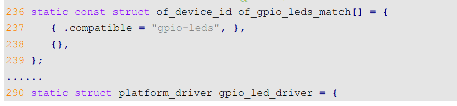 第 236~239 行,LED 驱动的匹配表,此表只有一个匹配项,compatible 内容为"gpio-leds", 因此设备树中的 LED 灯设备节点的 compatible 属性值也要为"gpio-leds",否则设备和驱动匹 配不成功,驱动就没法工作。