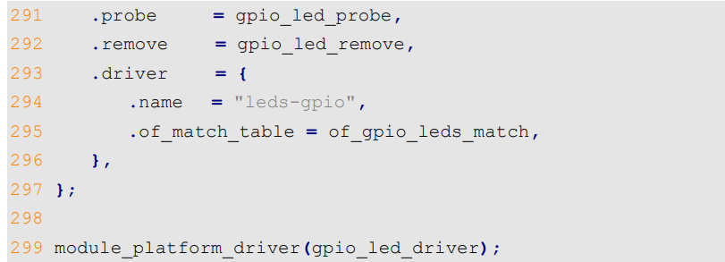 第 299 行通过 module_platform_driver 函数向 Linux 内核注册 gpio_led_driver 这个 platform 驱动。