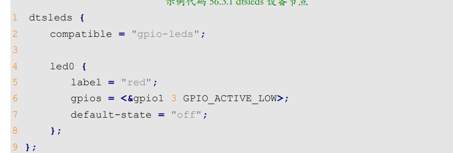 ①、创建一个节点表示 LED 灯设备,比如 dtsleds,如果板子上有多个 LED 灯的话每个 LED 灯都作为 dtsleds 的子节点。
