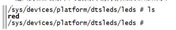 从图 可以看出,在 leds 目录下有一个名为"red"子目录,这个子目录的名字就是我 们在设备树中第 5 行设置的 label 属性值。