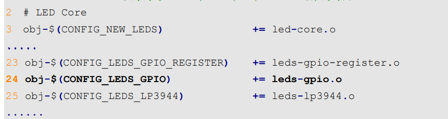 第 24 行,如果定义了 CONFIG_LEDS_GPIO 的话就会编译 leds-gpio.c 这个文件,在上一小 节我们选择将 LED 驱动编译进 Linux 内核,在.config 文件中就会有"CONFIG_LEDS_GPIO=y" 这一行,因此 leds-gpio.c 驱动文件就会被编译。