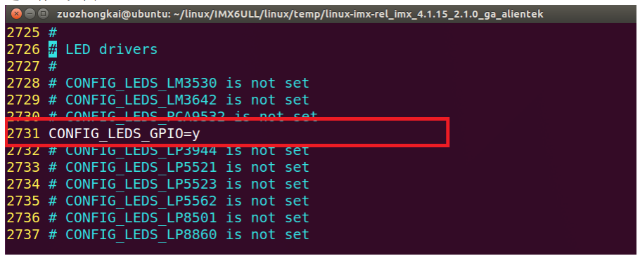 配置好 Linux 内核以后退出配置界面,打开.config 文件,会找到"CONFIG_LEDS_GPIO=y" 这一行,如图