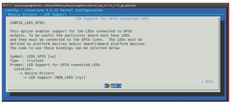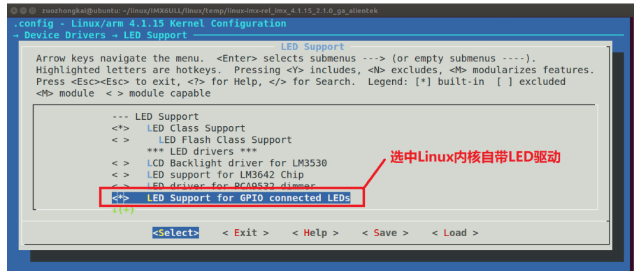 从 图 可 以 看 出 , 把 Linux 内 部 自 带 的 LED 灯 驱 动 编 译 进 内 核 以 后 , CONFIG_LEDS_GPIO 就会等于'y',Linux 会根据 CONFIG_LEDS_GPIO 的值来选择如何编译 LED 灯驱动,如果为'y'就将其编译进 Linux 内核。