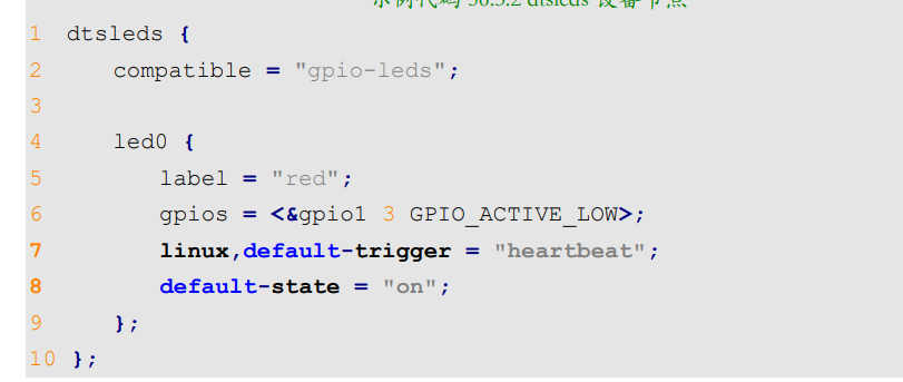 第 204~205 行,获取"linux,default-trigger"属性值,可以通过此属性设置某个 LED 灯在 Linux 系统中的默认功能,比如作为系统心跳指示灯等等。