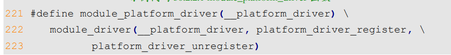 在上一小节中我们知道 LED 驱动会采用 module_platform_driver 函数向 Linux 内核注册 platform 驱动,其实在 Linux 内核中会大量采用 module_platform_driver 来完成向 Linux 内核注 册 platform 驱动的操作。module_platform_driver 定义在 include/linux/platform_device.h 文件中, 为一个宏,定义如下: