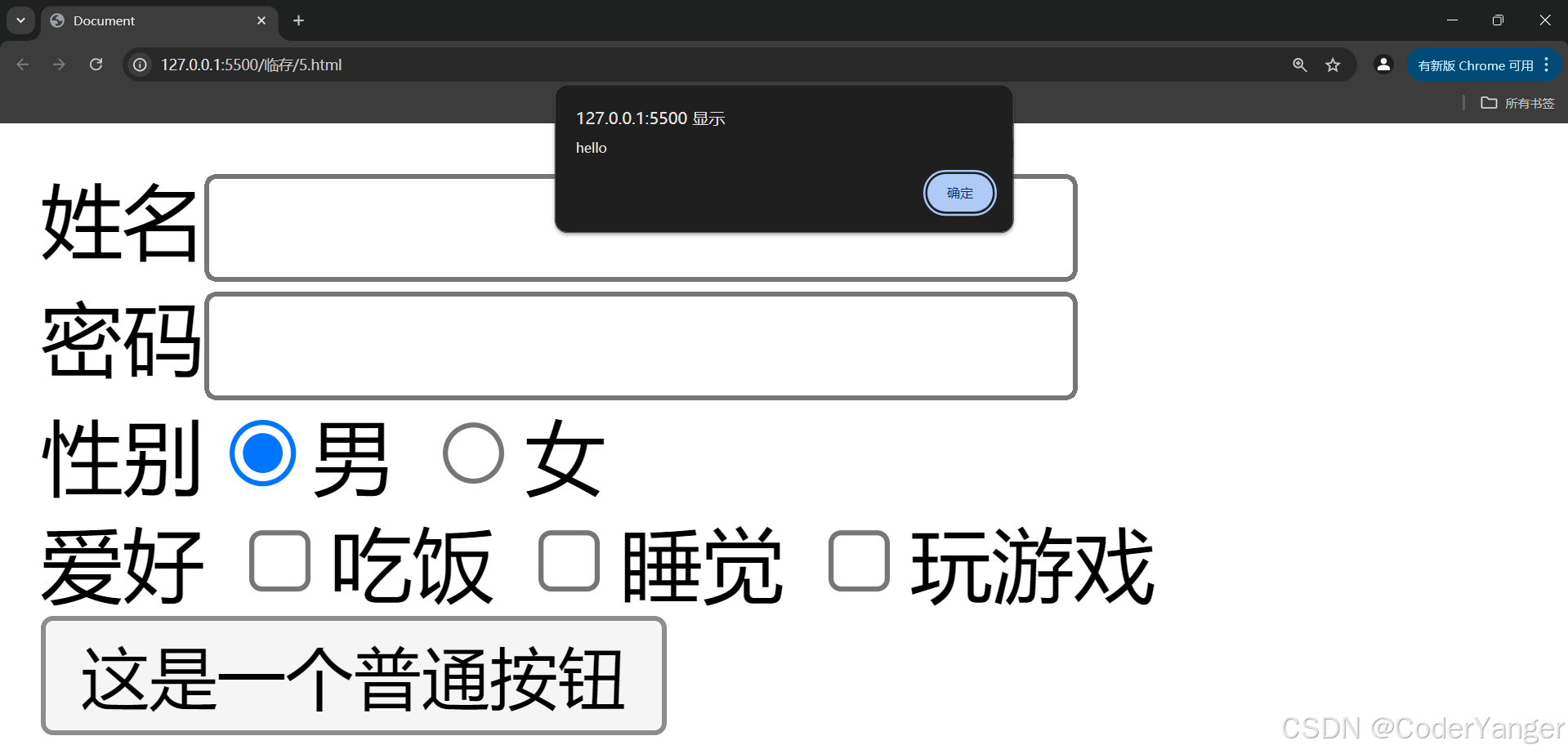 <input type="button" value="这是一个普通按钮" onclick="alert('hello')">