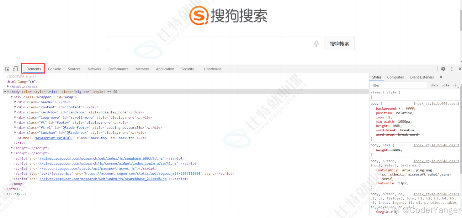 开启开发者工具:F12或右键审查元素,切换到 Elements 标签, 就可以看到页面结构细节: