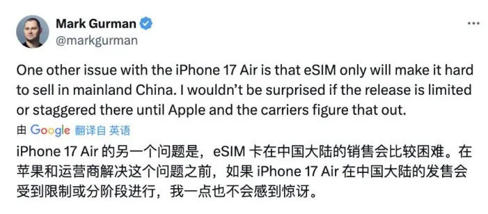 目前国内运营商对 eSIM 的支持仍局限于智能手表等设备,尽管中国联通已在25省市重启eSIM业务,中国移动和中国电信也在做准备,但iPhone17 Air 能否在国行版本中顺利推行 eSIM,还取决于苹果与国内运营商的合作进展。