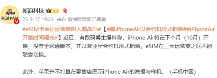 结合近期数码博主爆料及行业动态,国内 iPhone Air 或采用运营商合约机模式发售: 绑定特定服务套餐且暂不支持 eSIM 自由更换。