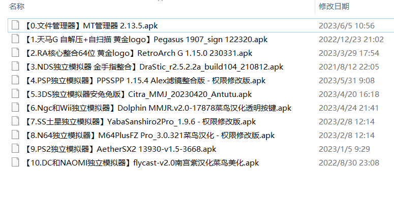 大概是这些内容,MT管理器是用来拷贝文件的,天马G就是整体入口,用的最多的其实还是RA,其它的就是各个单独的模拟器。我是用adb装过去的。安装完成之后启动一下赋予权限,不需要再高别的什么。