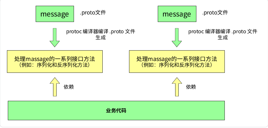 依赖生成的接口,将编译生成的头文件包含进我们的代码中,实现对 .proto 文件中定义的字段进行设置和获取的方法 ,和对message 对象进行序列化和反序列化的方法(proto编译器会根据我们定义的结构对象自动生成这些方法)。