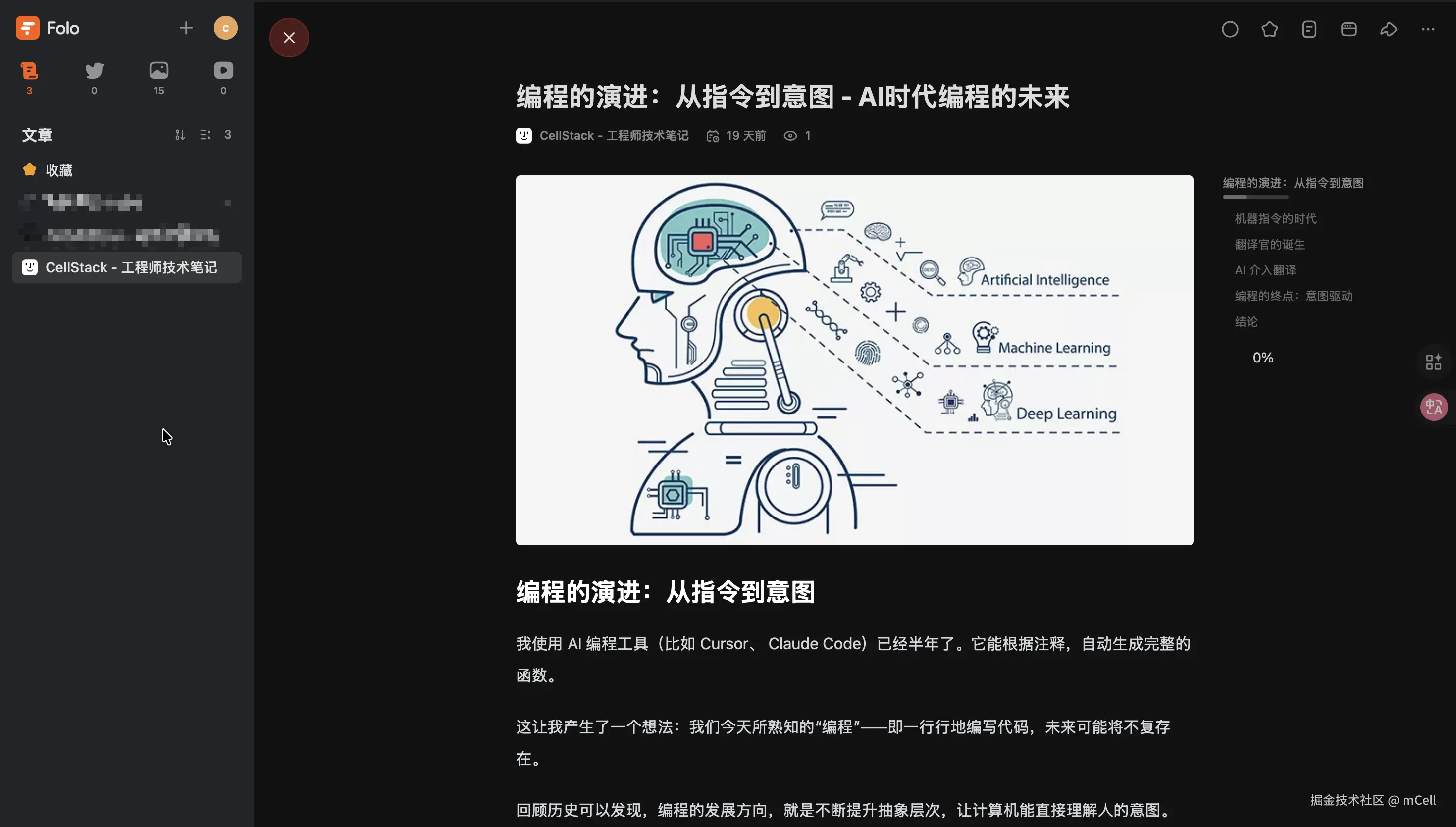 比如这里,我的 FOLO 订阅了 CellStack 的 RSS 源之后,就可以看到 CellStack 的最新内容:
