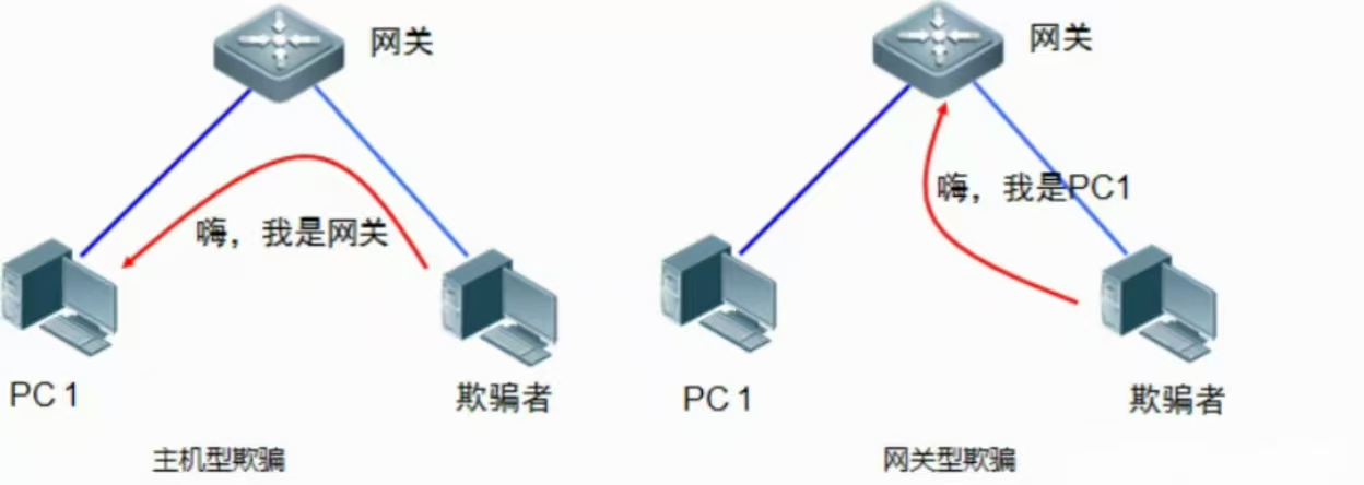 - 欺骗者也可以修改网关中PC1的IP与Mac地址的映射,此时PC1发送给网关的数据发送到了欺骗者这里,同样网关给PC1的数据也到欺骗者这里了;此时欺骗者可以将数据发送给双方,但是双方并不知道用改中间人的存在。