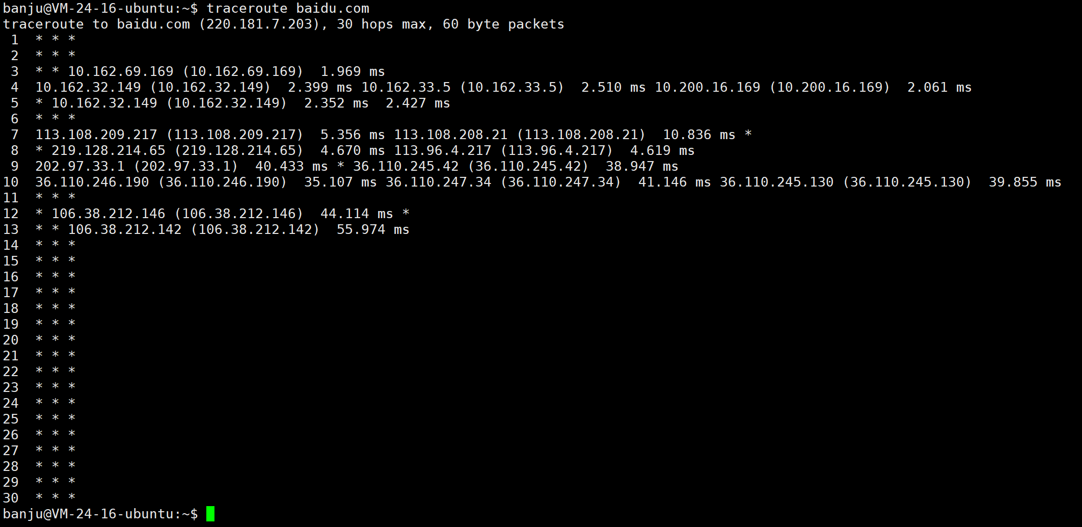 命令,也是基于ICMP实现的,是一款核心的网络诊断工具 ,主要用于追踪数据包从本地设备 到目标主机 (如某个网站、服务器)的完整传输路径,并记录路径中每一个 "中间节点"(通常是路由器)的信息:!