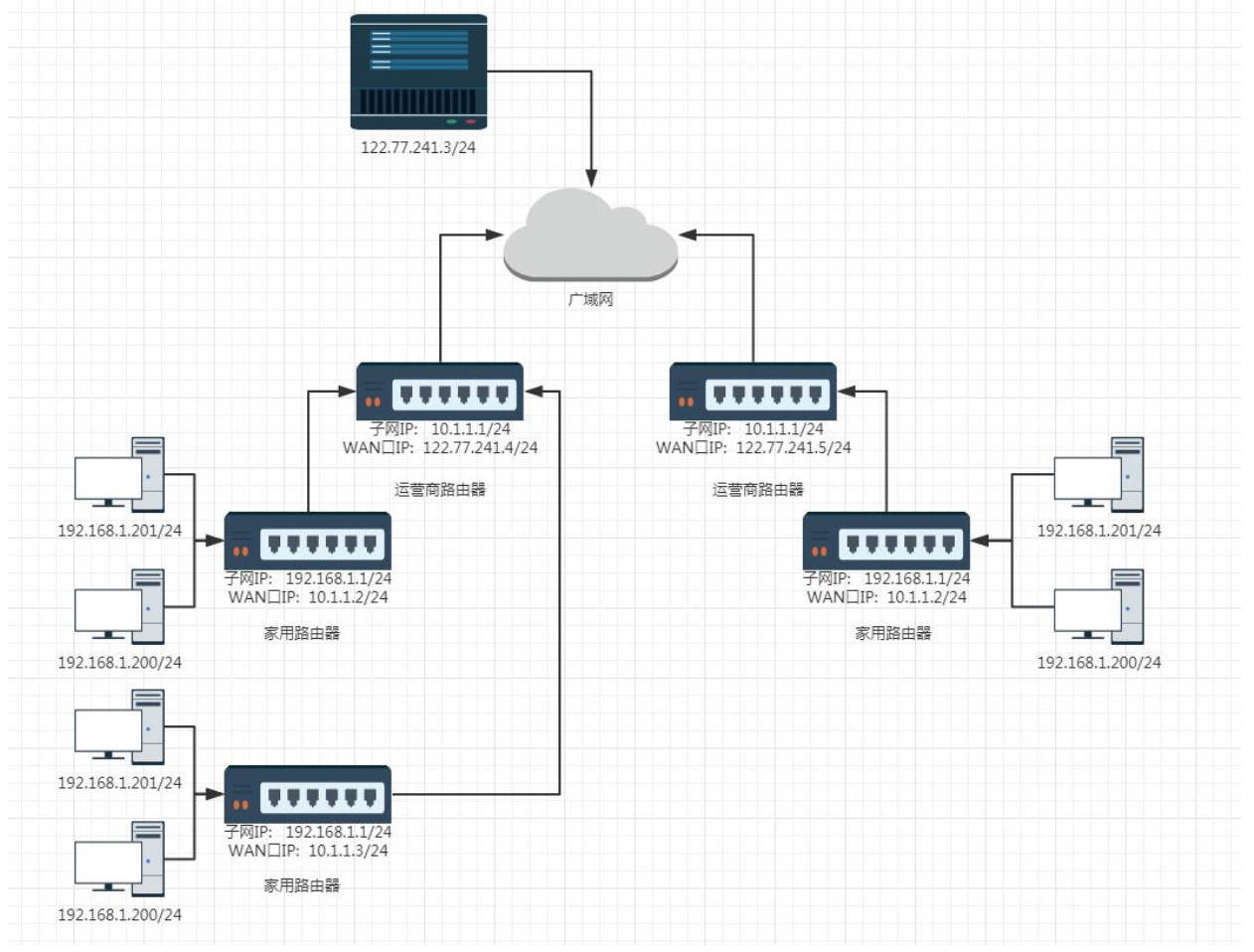 - 家用路由器可以进行子网的构建,那么全国中一定有多个家用路由器,这些路由器也要构建一个子网才能进行通信,由运营商的路由器进行构建,也就是说家用路由器的另一侧也并不是广域网,而是运营商路由器构建的子网;