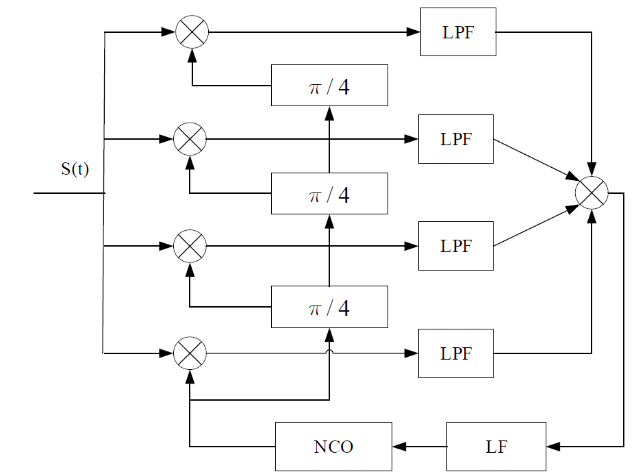 移相所得共四路信号分别相乘,并且将四路结果分别经过低通滤波器滤除不需要的高频分量,之后对这四路信号进行乘法运算完成鉴相,鉴相结果送入环路滤波器(LF),其输出结果送入NCO 对生成本地信号进行控制。