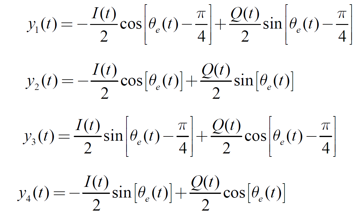 输入信号与四路不同相位信号的相乘,并且经过低通滤波之后输出的信号分别为: