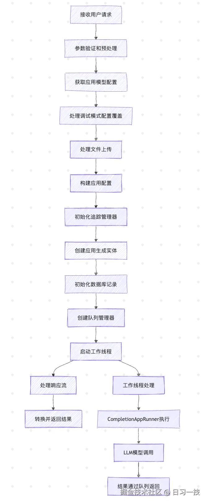 );接着创建一个 队列管理器(App Queue Manager) ,它负责管理应用执行过程中的事件流,实现 生产者-消费者 模式的异步通信;最后启动工作线程,创建 应用运行器(App Runner),执行具体的生成逻辑,并通过队列管理器传递生成结果,同时主线程通过队列管理器监听执行结果,实现了请求处理和业务执行的解耦。整体流程如下: