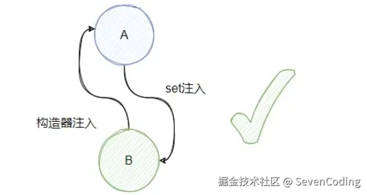 假设我们 A 是通过 set 注入 B,B 通过构造函数注入 A,此时是成功的。