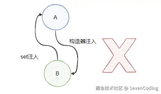 假设 A 是通过构造器注入 B,B 通过 set 注入 A,此时是失败的。