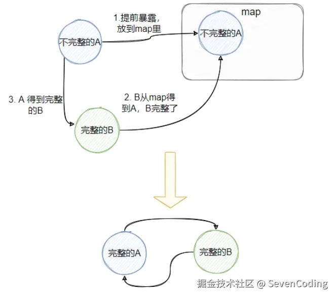 具体做法就是:先创建A,此时的A是不完整的(没有注入B),用个 map 保存这个不完整的A,再创建B,B需要A,所以从那个map 得到"不完整"的A,此时的B就完整了,然后A就可以注入B,然后A就完整了,B也完整了,且它们是相互依赖的。