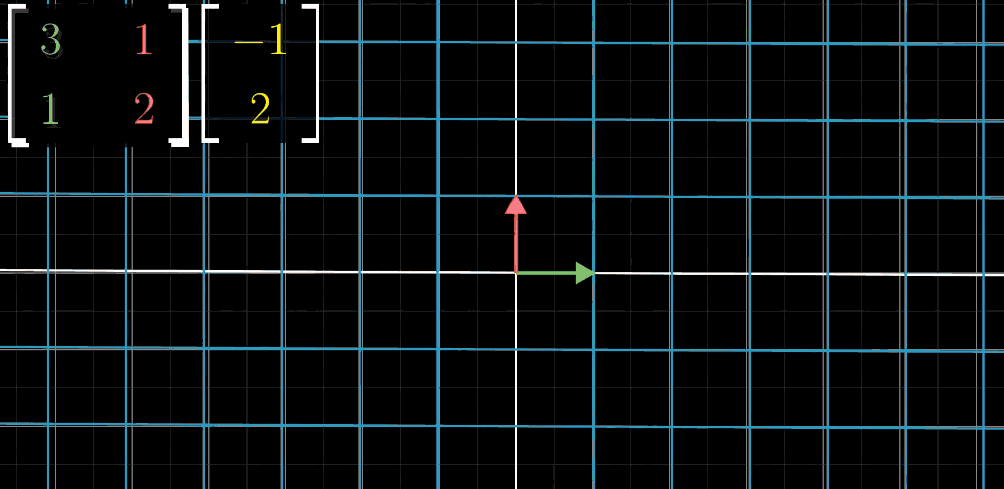 示例 :若变换矩阵 A = [ 3 1 1 2 ] A = \begin {bmatrix} 3 & 1 \\ 1 & 2 \end {bmatrix} A=[3112]( ı ^ \hat {\imath} ^→ [ 3 1 ] \begin {bmatrix} 3 \\ 1 \end {bmatrix} [31], ȷ ^ \hat {\jmath} ^→ [ 1 2 ] \begin {bmatrix} 1 \\ 2 \end {bmatrix} [12]),向量 x ⃗ = [ − 1 2 ] \vec {x} = \begin {bmatrix} -1 \\ 2 \end {bmatrix} x =[−12] 的变换结果为: