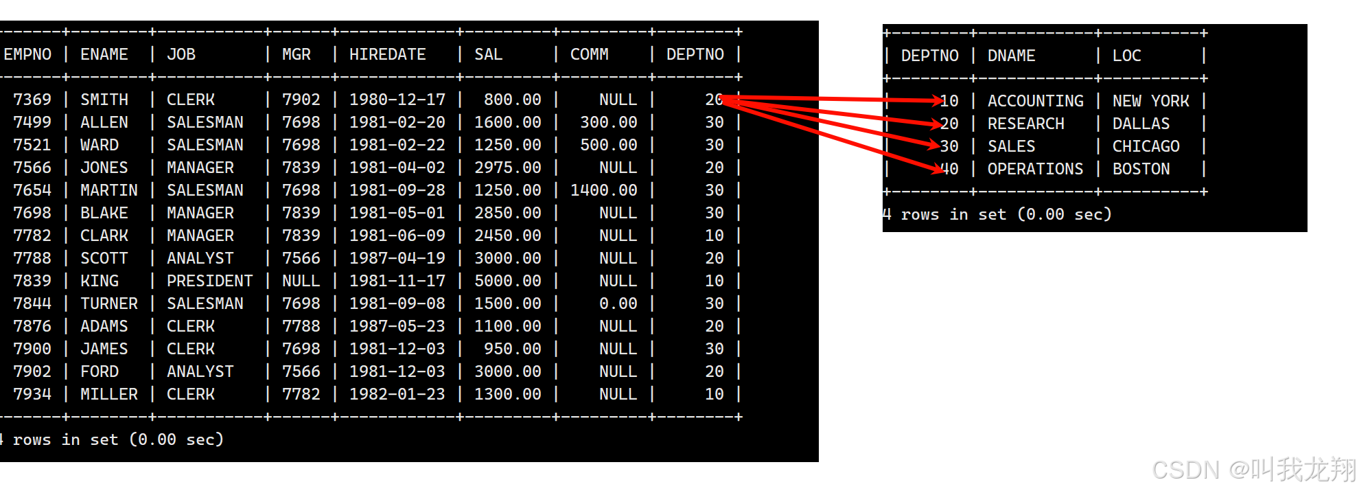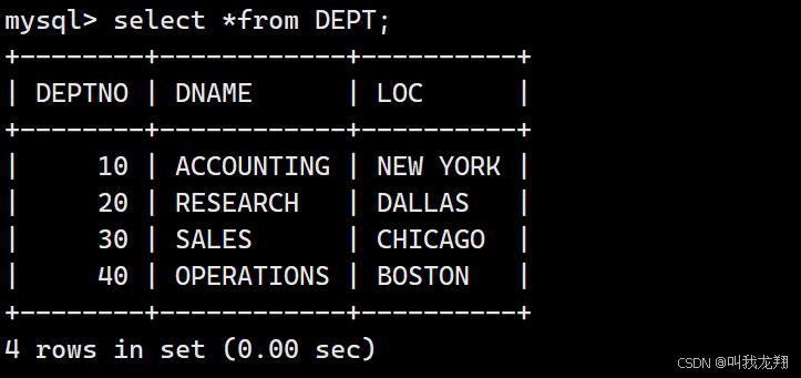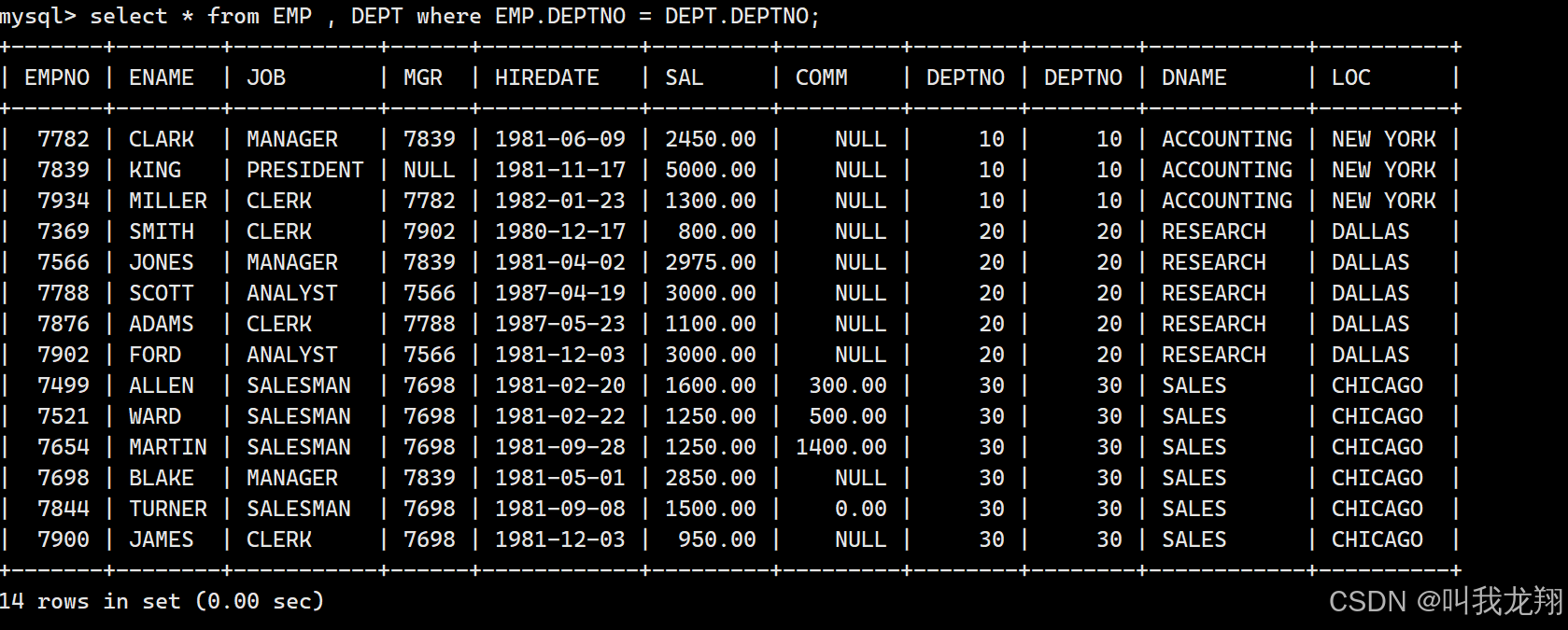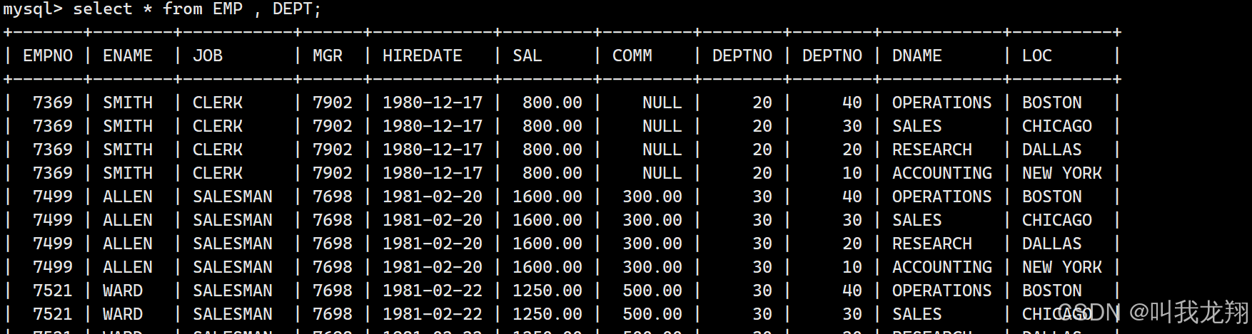 这个表是由笛卡尔积得到的,EMP表中的每个数据都与DEPT的数据进行一次匹配整合。