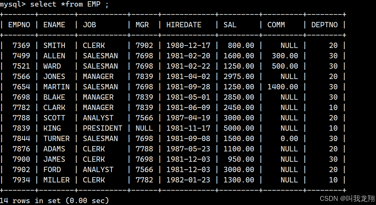 | 7698 | BLAKE | MANAGER | 7839 | 1981-05-01 | 2850.00 | NULL | 30 |