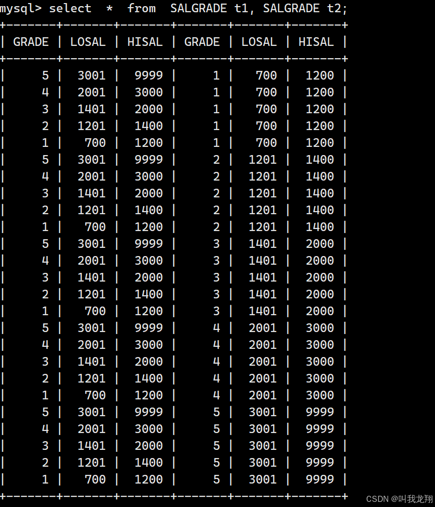 mysql> select * from EMP , SALGRADE WHERE EMP.SAL between LOSAL and HISAL;