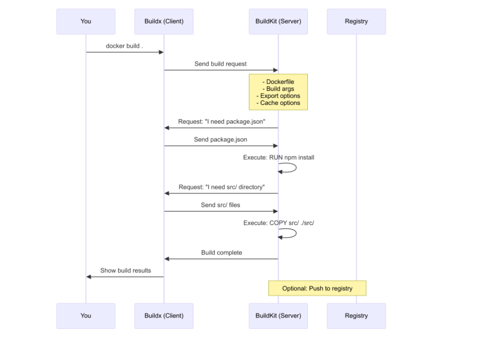 首先,它会发送一个包含 Dockerfile、构建参数、导出选项和缓存选项的构建请求。然后,BuildKit 会智能地在需要时仅请求所需的文件,首先从 package.json