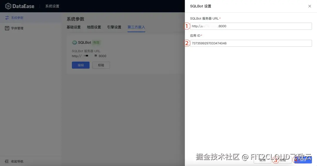 ② 将之前在SQLBot中创建好的"DataEase"应用中"SQLBot服务器URL"和"应用ID"填入对应的输入框中,校验成功并保存设置;