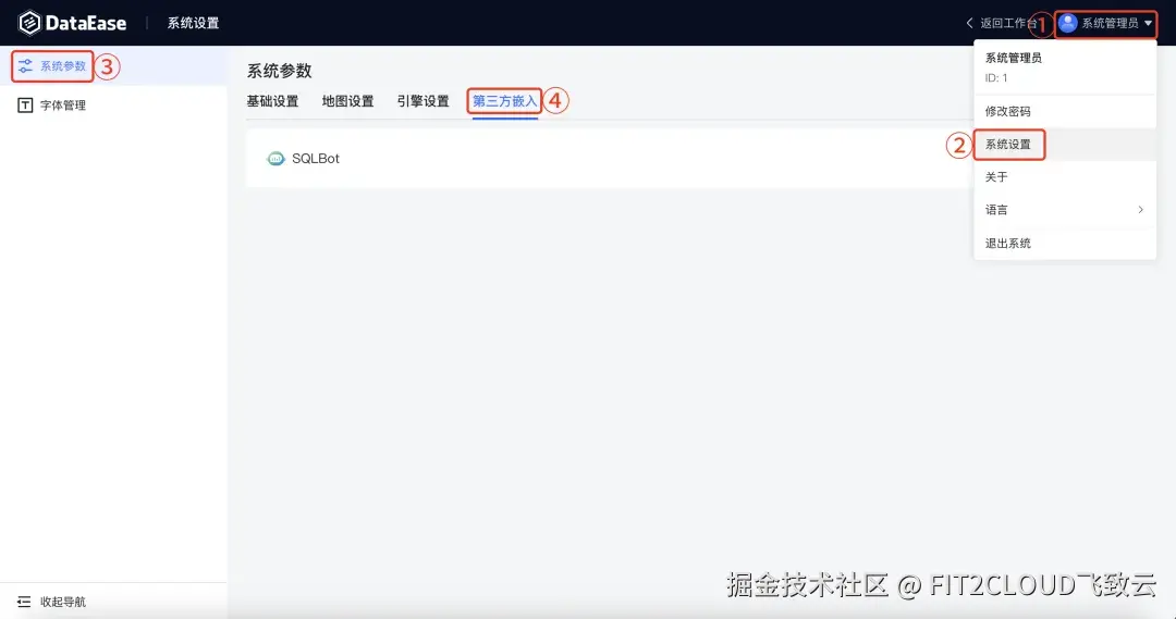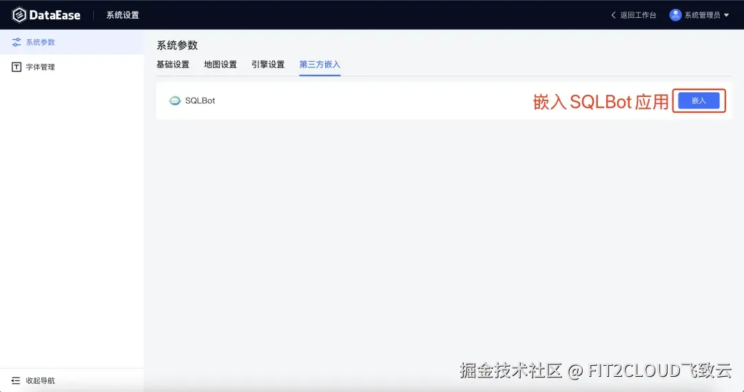 ① 进入DataEase的"系统设置"菜单,在"系统参数"页面选择"第三方嵌入"选项卡,在其中点击"嵌入"选项,嵌入SQLBot应用;
