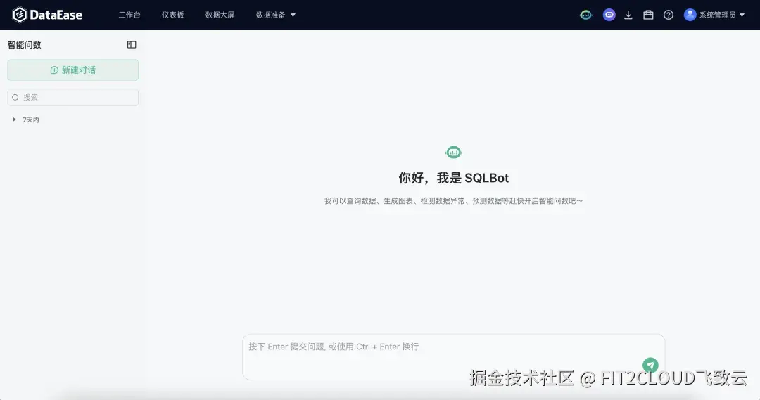 在DataEase首页的菜单栏,点击界面顶部的SQLBot图标,进入智能问数界面,即可通过自然语言提问的方式,对DataEase中的数据进行智能问数。用户可以基于数据直接生成可视化图表,并且可以让大模型对问数的结果进行进一步的数据分析。