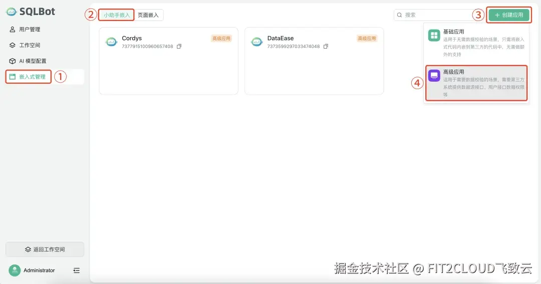 在SQLBot中选择"系统管理"→"嵌入式管理",进入"小助手嵌入"选项卡,在这里创建一个可以满足DataEase数据校验要求的高级应用,我们将其命名为"DataEase"。