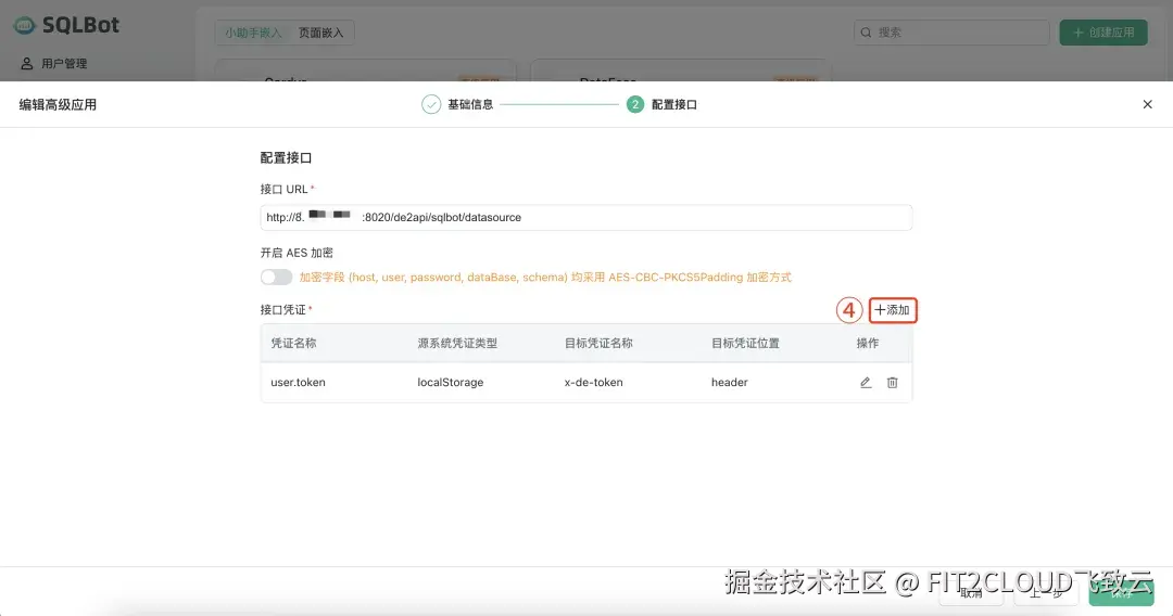 ④ 添加接口凭证,在接口凭证编辑框中填写如下信息:
