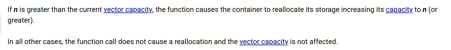 在所有其他情况下(即n小于或等于当前容量),函数调用不会导致重新分配,并且容量不受影响。