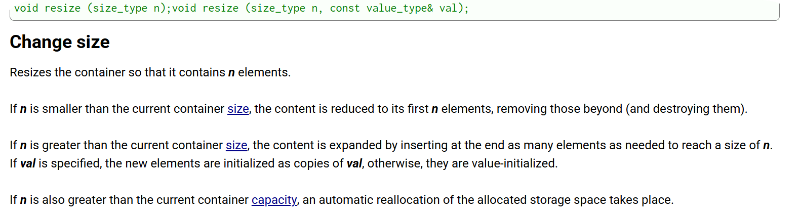 如果 n 大于当前容器大小,则通过在末尾插入所需数量的元素来扩展内容,以达到 n 的大小。如果指定了 val ,则新元素将初始化为 val 的副本,否则,它们将被值初始化。